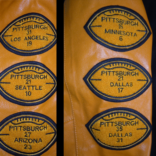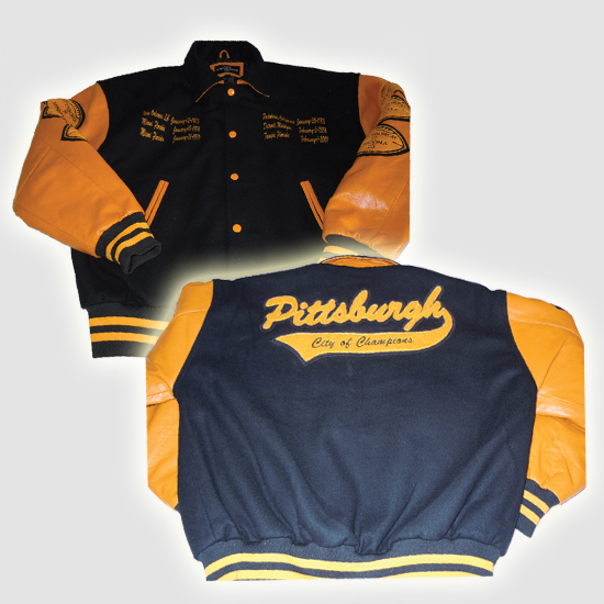 Show your Black and Gold Pride with this Pittsburgh Six -Time Champions Commemorative varsity-style leather jacket.