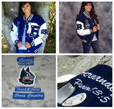 The knit trim featured two bright white stripes. we did a chenille graduation patch and a custom Redlands mascot.